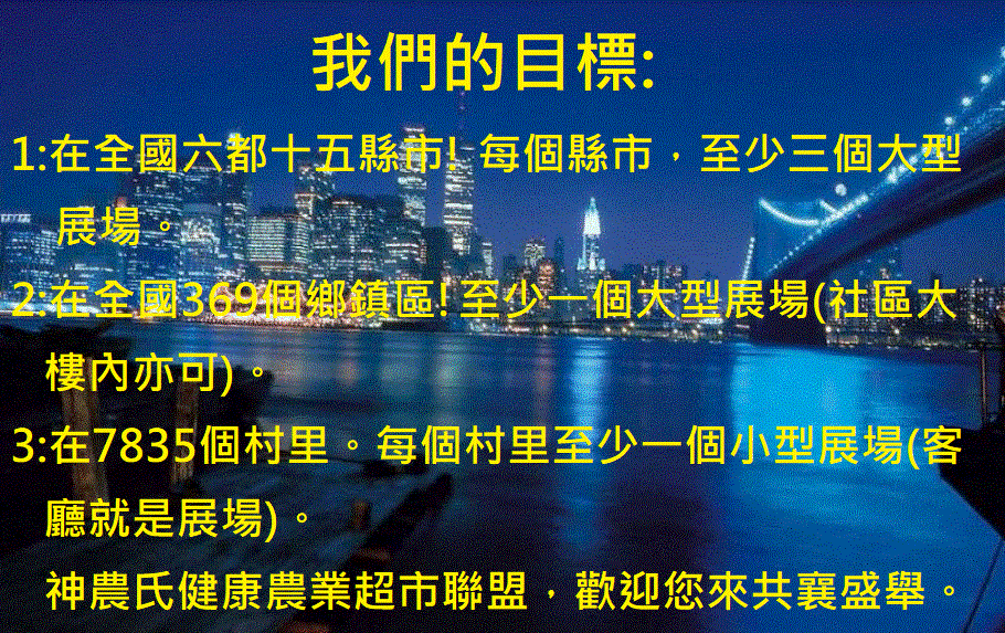 歡迎村里開神聯健康超市,每個人把神農氏健康超市消費一千就帶回家!神農氏健康超市消費,消費全返100%,現在加碼回饋100%=200%‘